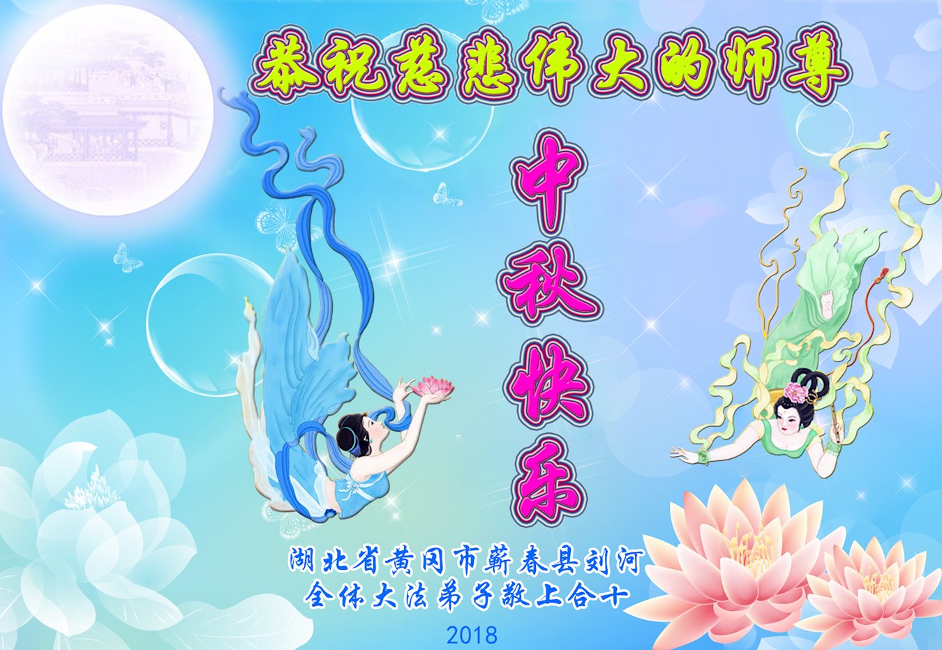 师父历尽千辛万苦,操尽人间天上事,无私付出,再造苍宇,拯救全宇宙。感谢师父慈悲救度之恩!我们要万分珍惜师父用心血换来的时间,用心做好三件事,修好自己,达到师父大法的标准;同时用心多救人,做个合格的“正法时期大法弟子”,谢师恩。 湖北省黄冈市蕲春县刘河全体大法弟子恭祝师尊中秋快乐!