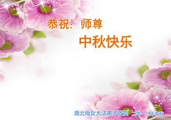 时间飞逝,转瞬间二零一八年中秋节又来临了,我们全体大法弟子唯有在修炼中更加成熟、圆容整体。在师尊指引的正法修炼路上走的更正、更稳,救度更多的众生,才能不辜负师尊的慈悲苦度啊!同时弟子惟愿师尊多一份欣慰,少一份操劳。再次叩拜师尊! 湖北宜昌枝江大法弟子恭祝师父中秋节快乐!