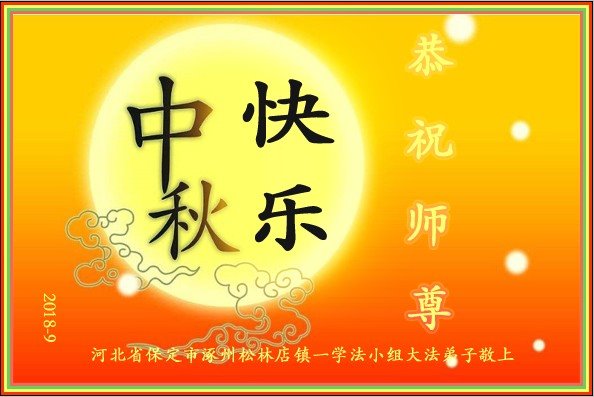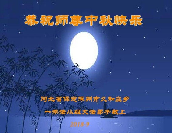 河北省保定市涿州松林店镇一学法小组大法弟子敬上 二零一八年九月 河北省保定涿州市义和庄乡一学法小组大法弟子恭祝慈悲伟大的师尊中秋节快乐!