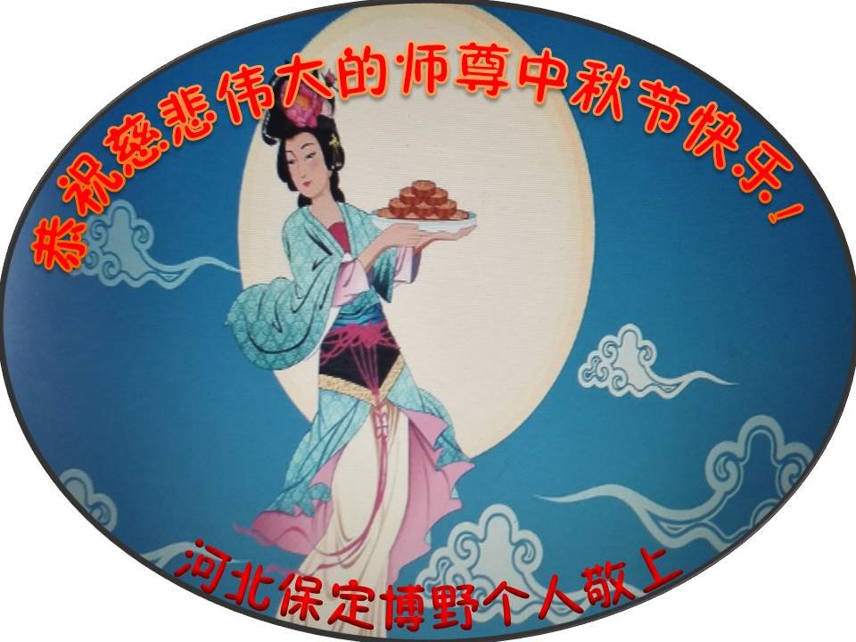 八月十五月儿圆 跪拜恩师泪涟涟 感恩师尊慈悲度 弟子精進永往前 救度世人是我愿 盼望有缘到跟前 喜迎师尊早归国 圆满随师把家还 河北省保定一大法弟子恭祝慈悲伟大的师尊中秋节快乐!