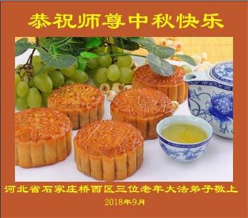 河北省石家庄桥西区三位老年大法弟子敬上 二零一八年九月 河北省石家庄市桥西区三个学法小组全体大法弟子祝师父中秋快乐!