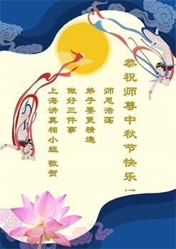 转眼又一年中秋节到了,弟子在此遥祝师父中秋快乐!在这值千金、值万金的珍贵时刻,弟子们一定更加精進,珍惜时间,学法入心,正念更强,讲清真相,兑现来世的誓愿! 上海全体大法弟子恭祝师尊中秋快乐!