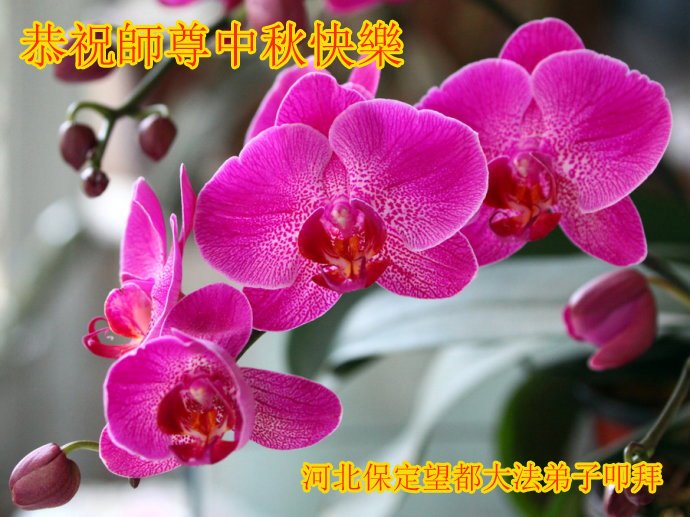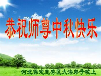 请师父放心:弟子们一定谨遵师尊教诲,学好法、紧密配合、正念正行、抓紧时间多救人,彻底破除旧势力及其一切安排,解体邪*党-的一切迫害干扰。大法弟子绝不辱使命! 在这中秋佳节到来之际,我们全体大法弟子想念师尊,叩谢师恩! 同时,我们代表所有受益的世人、所有得救的各界众生感谢师父慈悲救度,祝您节日快乐! 河北省保定大法弟子恭祝师尊中秋节快乐!