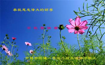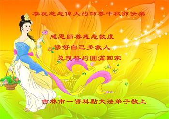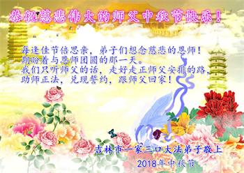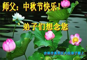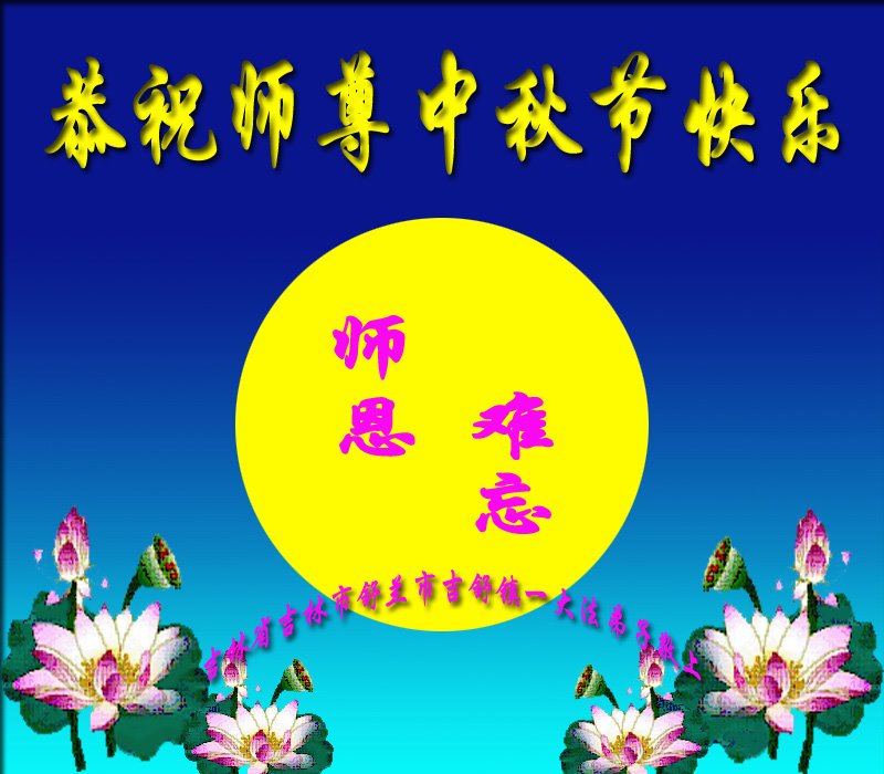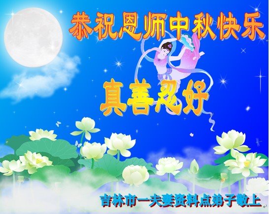 弟子修炼法轮大法身心受益,感恩师父慈悲救度!弟子盼望师父早日回中国大陆! 吉林市一家两位大法弟子恭祝慈悲伟大的师父中秋节快乐!