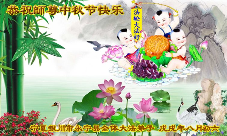 师父好!师父中秋节快乐!此时此刻,弟子心中充满了对师父的无限感恩与敬仰。弟子跟着师父走过了二十年的风风雨雨,最终坚定的在这场最残酷的迫害中走了过来。弟子的每一颗执着心的去掉,都溶入了师父无量的慈悲;弟子心性的每一次升华都离不开师父的帮助;弟子的修炼路上让师父操尽了心。弟子唯有万分珍惜并懂得这万古不遇的修炼机缘,才能回报师恩,才能兑现自己的史前大愿!弟子叩谢师恩! 宁夏银川市永宁县全体大法弟子恭祝伟大慈悲的师尊中秋节快乐!