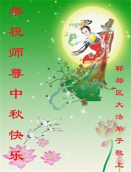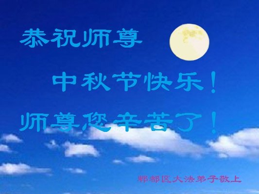 师尊,虽然弟子们离法的标准还很远,请师父放心,弟子们一定努力,做好三件事,跟师父回家! 叩谢师尊的慈悲救度,恭祝伟大慈悲的师尊中秋节快乐! 四川成都青年大法弟子学法小组敬上 四川省成都大法弟子恭祝师尊中秋快乐!