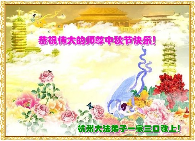尊敬的师父好!浙江杭州大法弟子想念师尊,坚信大法,做好大法弟子该做的三件事。修好自己,让师尊放心!顺祝师父中秋节快乐! 浙江嘉兴五县二区大法弟子祝师尊中秋节快乐!
