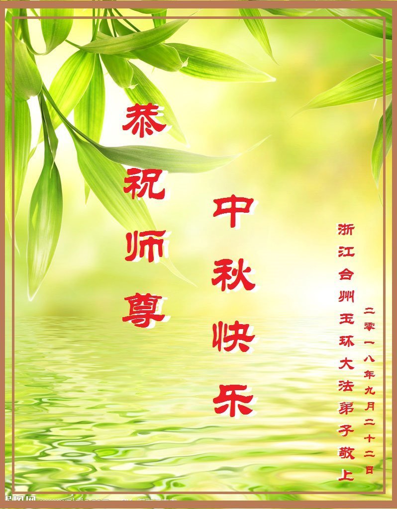 浙江省台州市临海市法轮大法弟子携妻子同修恭祝师尊中秋快乐! 师尊的安排都是最好的,感谢师尊让弟子工作领先,感谢师尊让弟子福如东海! 二零一八年九月二十一日 浙江杭州大法弟子祝愿师父中秋节快乐!