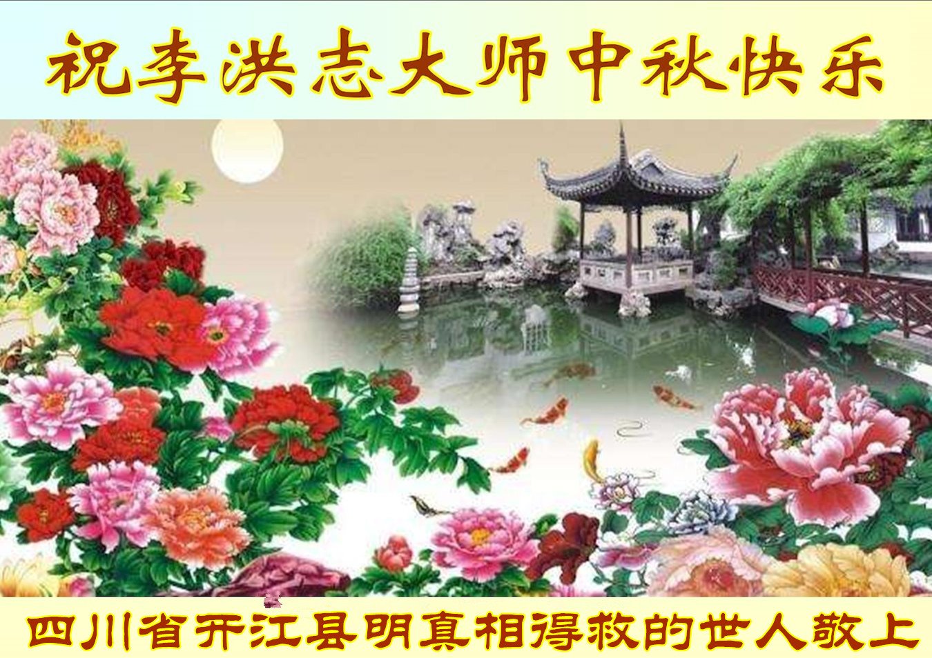 祝慈悲伟大的师尊中秋佳节快乐!师尊您辛苦了! 感谢师尊的救度之恩! 四川省德阳市中江县大法弟子恭祝师父中秋快乐!