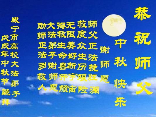 湖北省咸宁市高校大法弟子恭祝师父中秋节快乐! 谢师恩 师父正法挽狂澜 救众生历尽艰险 新宇宙无限美好 得救生命谢师恩 大法弟子奉师命 正法修炼救众生 师父洪恩无以报 助师正法多救人 咸宁市高校大法弟子跪拜师恩 二零一八年八月十五日中秋节 湖北省孝感市大悟县大法弟子恭祝师父中秋节快乐!