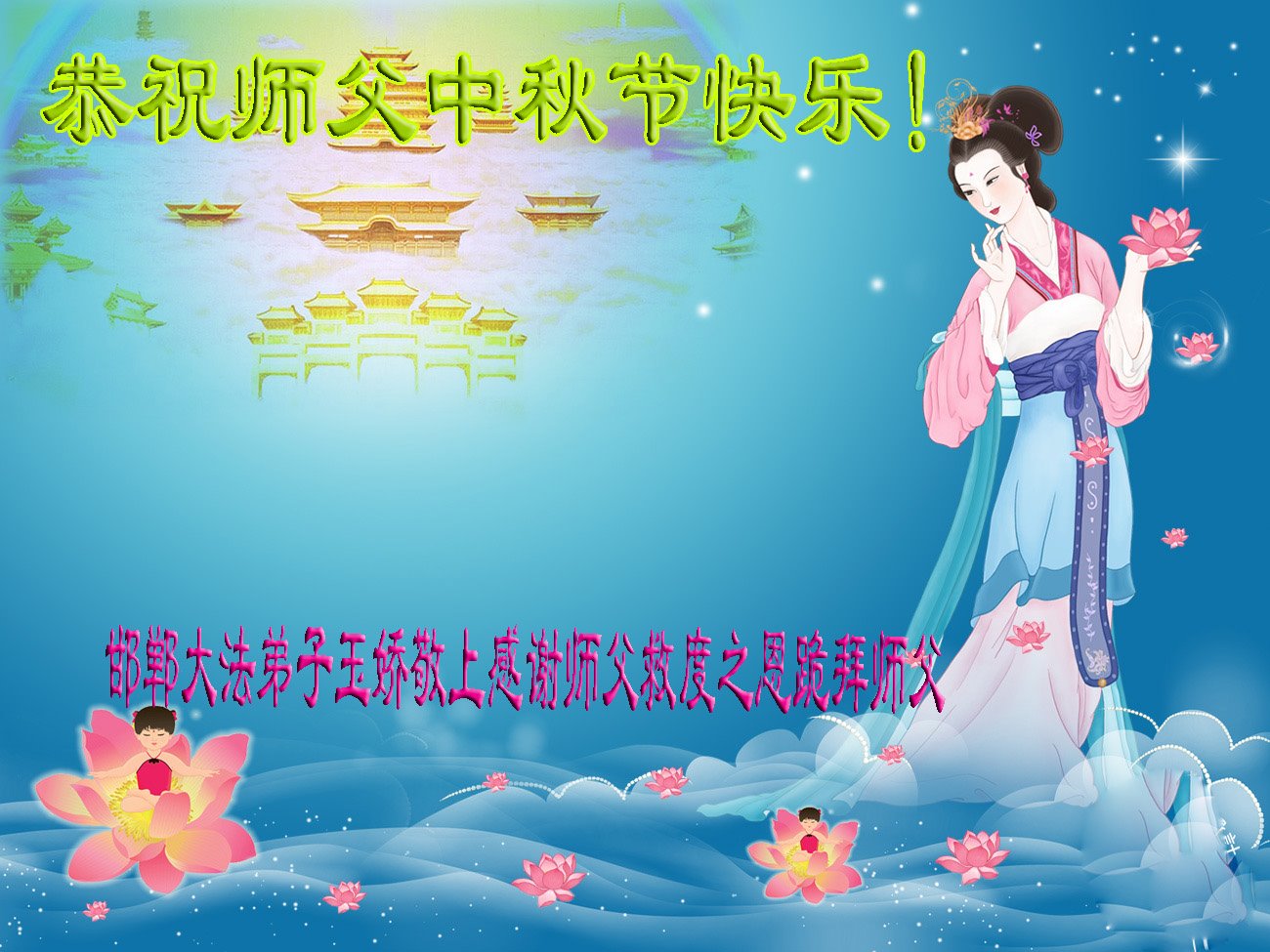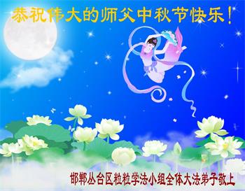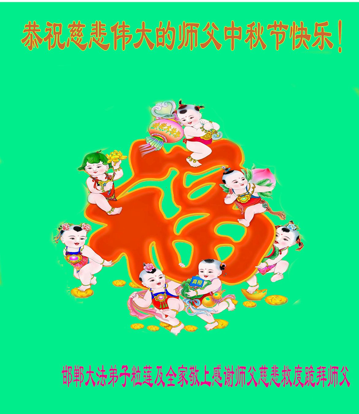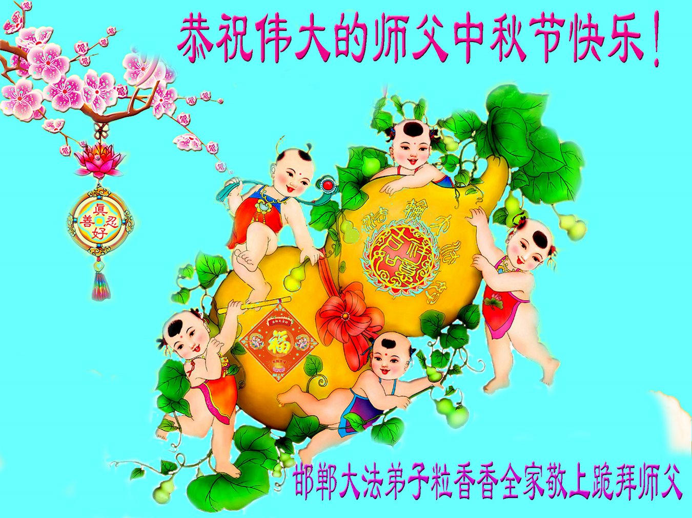 师尊您好!师尊辛苦了!弟子在这最后所剩不多的时间里,学好法、坚定正念、做好三件事。相互配合、整体提高,讲清真相多救人,完成史前大愿。让师尊多一份欣慰、少一份操劳,不负师恩。谢谢师尊慈悲苦度! 弟子叩拜师父! 河北省邯郸市邱县全体大法弟子恭祝师尊中秋节快乐!