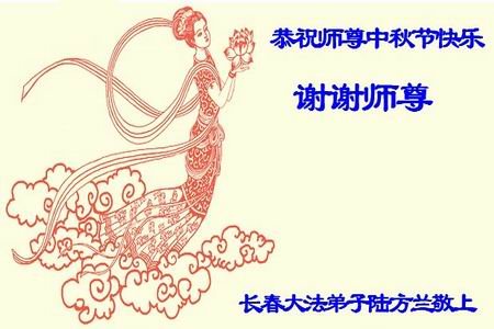 师尊您辛苦了!在这万劫不复的宇宙大穹更新过程中,师尊给予弟子无上的修炼、救人机缘。愚钝的弟子常常泪流满面,无限感恩师尊的宏大慈悲,苦心救度。冥冥中师尊时时刻刻看护弟子,时时点悟弟子走正修炼路。师尊为弟子和众生操碎了心,在传统的中秋节到来之前,弟子虽不能和师尊一起共度中秋佳节,但弟子的心期盼师尊早日回到家乡和弟子们团聚! 谢谢师尊!您辛苦了! 吉林省长春大法弟子恭祝师尊中秋快乐!