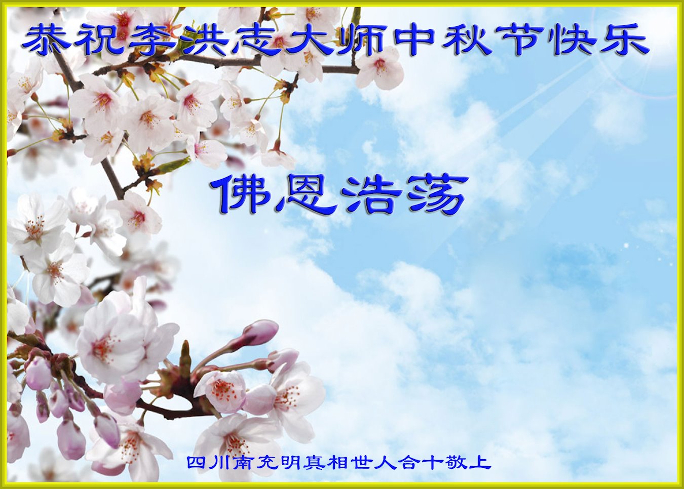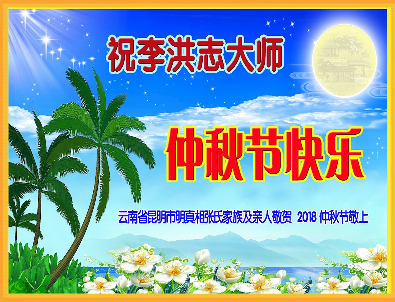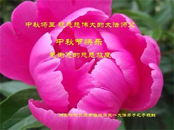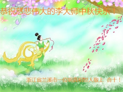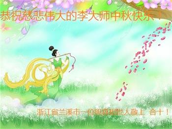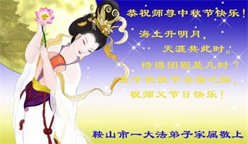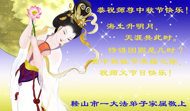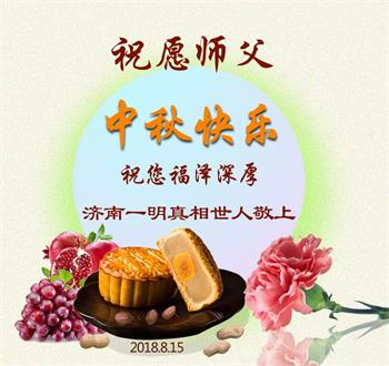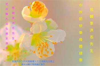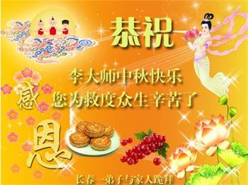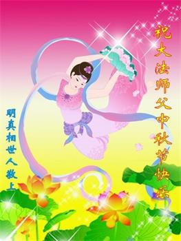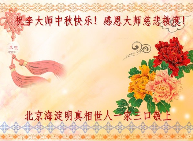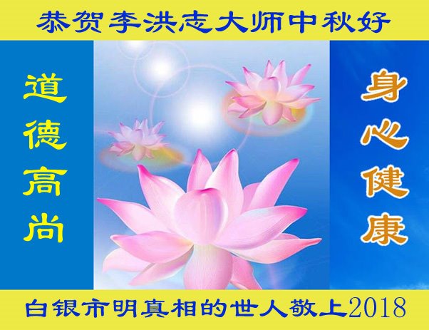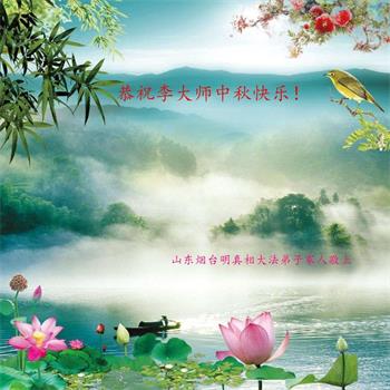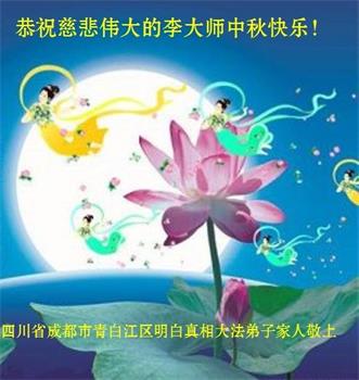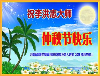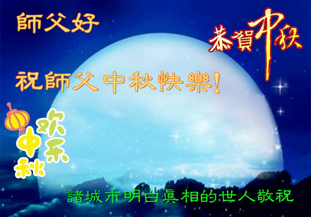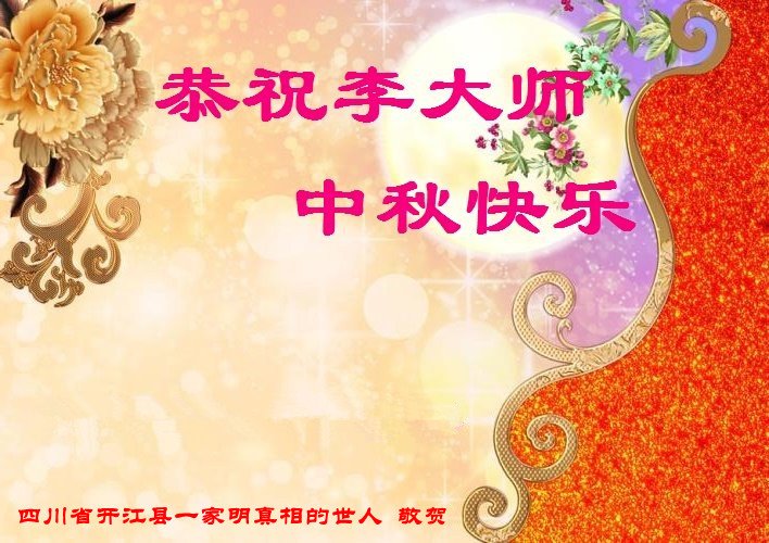 | 【明慧网二零一八年九月二十四日】中秋佳节之际,中国大陆民众借此团圆之日向法轮功师父祝贺中秋快乐!并表示他们非常相信法轮大法好,真善忍好! 河南许昌市市民在贺信中说:“感恩李大师的慈悲救度!让我们明白真相。如果人人都能知道真相,按‘真善忍’去做,那这世界将会变的多么美好!” 四川省成都市青白江区法轮功学员的家人说:“虽然这些年家人遭到迫害的同时给我们造成不少的压力,但是我们一直支持她们的信仰。相信法轮大法好,真、善、忍好!感谢李大师的救度,望李大师早日回归中原故里。” 维权人士王清营祝愿李洪志先生中秋快乐!