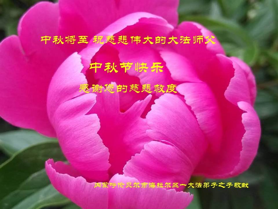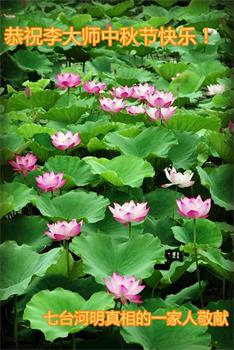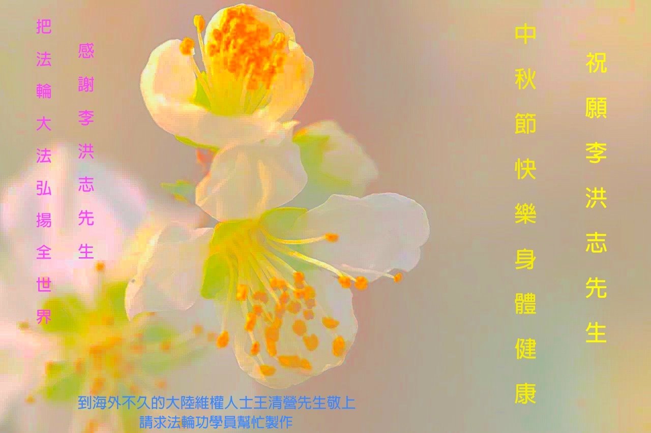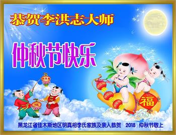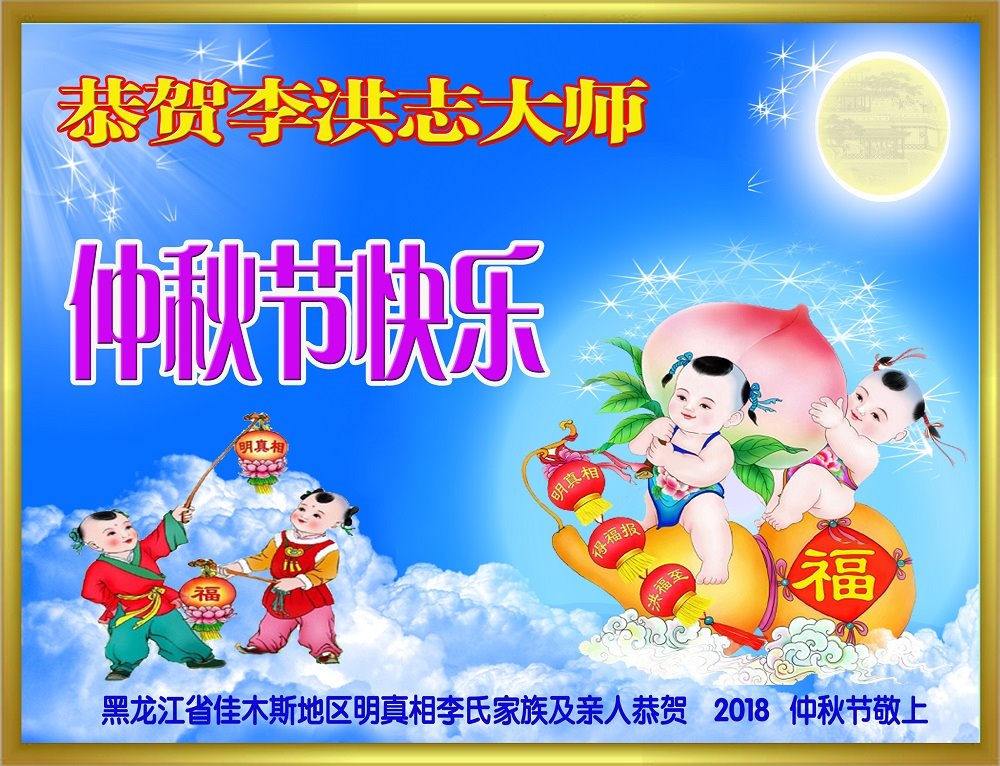 不久前来到美国的大陆维权人士王清营祝愿李洪志先生中秋快乐,身体健康!感谢李洪志先生把法轮功洪传给世界。 为此,特意请法轮功学员帮助制作贺卡,希望表达对李洪志先生的祝愿。 北京市民:“快中秋节了,请替我们向李洪志大师问好!”今天,一位了解法轮大法真相、并且全家做了“三:退.”的女士,见到我们学法小组的大法弟子后神秘的说:“我知道,咱们区修炼法轮功的还有九零后的哪,都是大学生。法轮功真了不起!但是要注意安全。我们全家都信法轮功。快中秋节了,替我们向李洪志大师问好,我们等着李大师回来。”还说:“如果有护身符我们家还想再请一枚。” 同修送给了她一枚“法轮大法好”护身符,她高兴的像个孩子,仔细揣進怀里,消失在熙熙攘攘的人群中。 河南许昌市明白真相的世人恭祝李大师中秋节快乐!恭祝慈悲伟大的李大师中秋节快乐!感恩李大师的慈悲救度!让我们明白真相,按照“真善忍”去做个好人!如果人人都能知道真相,按“真善忍”去做,那这世界将会变的多么美好!法轮大法好!真善忍好! 山东诸城市明白真相的世人祝大法师父中秋节快乐!四川内江大法弟子家人恭祝李大师2018年中秋快乐!法轮大法好!真善忍好! 甘肃白银市明真相世人恭祝李大师中秋快乐!黑龙江七台河明真相一家人恭祝李大师中秋快乐!山东招远市大法弟子的家人和明真相的世人恭祝大法师父中秋节快乐!幸福!大法弟子家人叩拜恩师!法轮大法好!大法师父好! 山东省威海荣成市一学法小组大法弟子及明真相的家人恭祝慈悲伟大的师父中秋节快乐!大陆明真相的大法弟子亲友恭祝李大师中秋快乐!山东烟台明真相的世人恭祝李大师中秋快乐!四川省开江县一家明真相的世人恭祝李大师中秋快乐!大陆明真相的世人祝大法师父中秋节快乐!山东菏泽市牡丹区一大法弟子及明白真相的家人恭祝慈悲伟大的师尊中秋节快乐!四川省成都市青白江区明白真相的大法弟子家人恭祝慈悲伟大的李大师中秋快乐!在中共这么多年对大法弟子的迫害中,使我们進一步认清了它的邪恶,也看到了您的弟子在按照“真、善、忍”理念指导自己的言行做好人。 虽然这些年家人遭到迫害的同时给我们造成不少的压力,但是我们一直支持她们的信仰。相信法轮大法好,真、善、忍好! 再次感谢李大师的救度,望李大师早日回归中原故里。 黑龙江省觉醒的世人恭祝伟大的师父中秋节快乐!内蒙呼伦贝尔市海拉尔区一大法弟子之子祝大法师父中秋节快乐!大陆一大法弟子家人恭祝大法师父中秋佳节快乐!云南省昆明市明真相张氏家族及亲人祝李洪志大师中秋节快乐!北京海淀区明真相世人一家三口恭祝李大师中秋快乐!祝您早日回到大陆浙江兰溪市一明真相世人恭祝慈悲伟大的李大师中秋快乐!愿慈悲伟大的李大师早日回大陆。 山东省平原县一名明真相世人祝李大师中秋节快乐!谢谢李大师让我明白大法好! 2018年9月15日 黑龙江大庆一大法弟子女儿恭祝慈悲伟大的李老师中秋快乐!山东济南一明真相世人问候师尊!祝师父中秋节快乐!辽宁省鞍山市铁东一大法弟子家属恭祝师尊中秋节快乐!辽宁省鞍山市铁东一大法弟子家属恭祝师尊中秋节快乐!山东省威海荣成市一大法弟子家人祝李大师中秋节快乐!尊敬的李大师好! 每年的八月十五,是我们中国人民的传统佳节,菊桂飘香,万家灯火,皓月当空,值此之际,借明月遥寄我们全家人诚挚的祝愿:恭贺大师中秋节快乐!祝您的家人及您所有的弟子中秋节快乐!大师佛恩浩荡,我们都是大法的受益者,感谢您的慈悲救度。期盼大师早日荣归故里,您是全人类的希望! 再次恭贺大师中秋节快乐! 山东省威海市荣成市一大法弟子家人敬上 2018年9月13日 山东临沂蒙阴县一对夫妇大法弟子携家人恭祝师父中秋快乐!曾经受邪*党-谎言毒害,排斥大法的家人,在见识了师父的慈悲伟大,法轮大法的神奇超常,并得到了大法的恩泽后非常感谢师父!现在都非常相信“法轮大法好、真善忍好”,并经常拿出一些钱赞助大法弟子做资料救人。虽数额有限,却表明了家人一颗敬仰大法的心。 值此中秋,我们全家十口人恭祝师父中秋快乐!谢谢师父! 黑龙江省佳木斯地区明真相李氏家族及亲人恭贺大师中秋节快乐!山东临沂市蒙阴县七十一名觉醒世人及大法弟子恭祝师尊中秋快乐!感谢师尊对众生的慈悲救度与保护! 师尊辛苦了!谢谢师尊! 四川南充明真相世人恭祝李大师中秋节快乐!在中秋佳节来临之际,我们所有受师父保护、明真相世人恭祝李大师中秋节快乐!合家欢乐! 谢谢您让您的弟子告诉我们法轮大法的真相,让我们也沐浴在您的佛光中,身体健康,生意兴隆,做事顺。我们也会帮助您的弟子传播法轮大法的真相,让更多的人受益。 谢谢您李大师! 四川南充明真相世人合十敬上 长春一大法弟子与家人恭祝李大师中秋快乐!一人炼功,全家人都受益。家人虽然不修炼,但都知道按照“真、善、忍”做好人,故身体都健康。 弟子与家人跪拜师尊 2018年9月17日 山东烟台招远一明真相世人恭祝伟大的大法师父中秋节快乐!感谢大法师父!拥护法轮大法!记住“法轮大法好,真善忍好!” 感谢大法师父的慈悲救度! 山东省潍坊临朐县明真相世人恭祝李大师中秋节快乐!