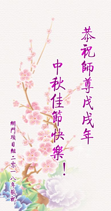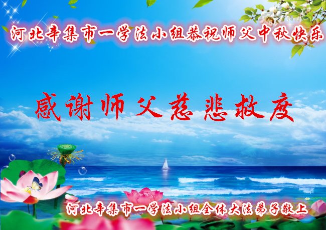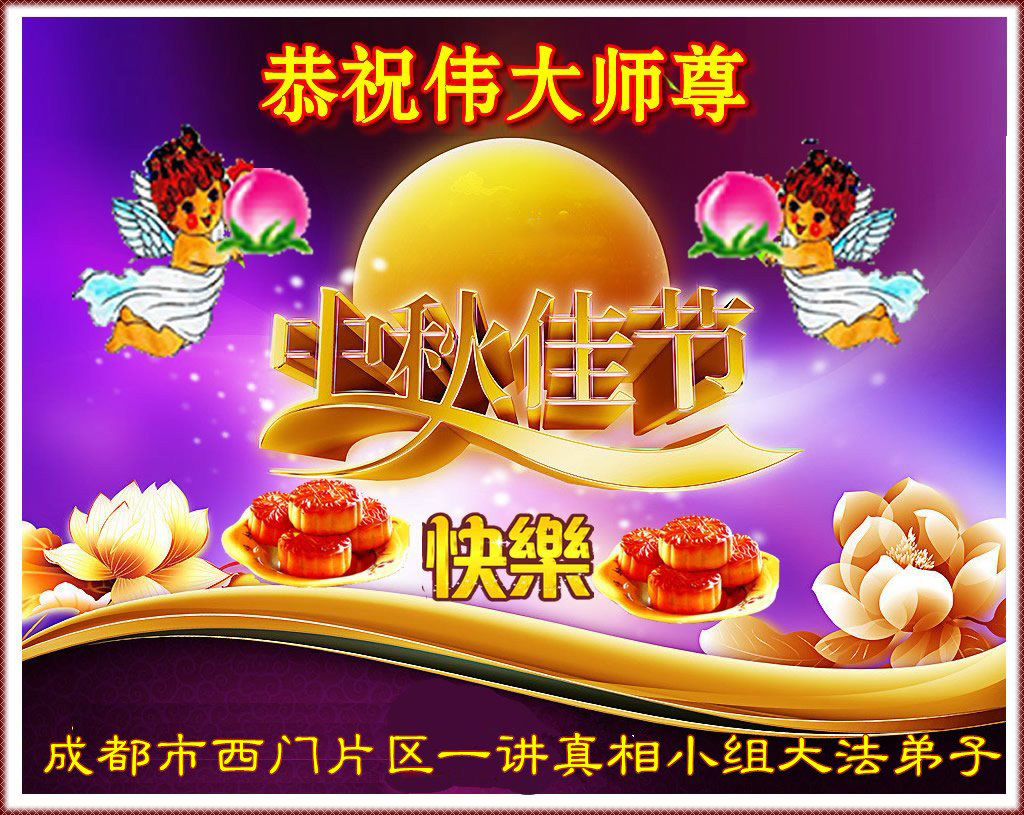 | 【明慧网二零一八年九月二十四日】中秋佳节到来,在这阖家团圆的时刻,大陆大法弟子深深的思念教导他们真、善、忍的恩师——李洪志先生。他们表示,在正法最后时期,整体配合好,广传大法真相,救度更多的众生。 长春三位大法弟子以一首小诗《中秋吟》表达他们的心声: “又是一年中秋夜 弟子含泪思师恩 千年轮回有师护 一朝得法在红尘 同化大法向内找 配合整体共提高 尽心做好三件事 修炼如初步别停 他日随师返天庭” 四川成都天天讲真相的十三个大法弟子恭祝师尊中秋节快乐!慈悲伟大的师尊好! 常言道:每逢佳节倍思亲。在这每年一度的中秋佳节来临之际,我们十三个每天面对面讲真相的大法弟子,万分感恩师尊的慈悲苦度,衷心的祝愿师尊中秋节快乐! 我们今后一定更加努力修好自己,风雨无阻的救度更多的世人,以谢师恩! 四川成都天天讲真相的十三个大法弟子贺 2018 年9月18日 河北张家口市宣化区一学法小组大法弟子恭祝师尊中秋节快乐!精進 田间地头身影现 大街小巷都走遍 遇事内找修心性 慈悲形像人人赞 时光匆匆流水过 兑现誓约永不惰 牢记三件事不耽 圆满随师返家园 2008年9月15日 河南周口一家庭资料点母女大法弟子恭祝师尊中秋快乐!广传真相救众生,一朵小花开家中。 黑云压城十几载,迎风傲雪散香风。 母遭迫害志不退,流离失所带花行。 源源不断奉精品,福音传遍乡与城。 女修大法婿受益,巨难压顶化轻松。 从此出门先敬师,心有底气是非清。 母女同修何幸运,比学必修随师行。 同化大法真善忍,兑现誓约回天庭。 辽宁省锦州市铁北讲真相小组大法弟子祝师尊中秋节快乐!师父您辛苦了!成都市西门片区一讲真相小组大法弟子恭祝伟大的师尊中秋佳节快乐!长春学技术小组三大法弟子恭祝慈悲伟大的师尊中秋快乐!师尊辛苦了!中秋吟 又是一年中秋夜 弟子含泪思师恩 千年轮回有师护 一朝得法在红尘 同化大法向内找 配合整体共提高 尽心做好三件事 修炼如初步别停 他日随师返天庭 唐山丰润一青年大法弟子恭祝师父中秋快乐!恭祝师父中秋快乐! 莲婷上班忙 不忘发真相 心看世人苦 慈悲好心肠 胸中有志向 大法心里装 众生都得救 兑誓返天乡 中秋问师好 心中把愿表 唐山丰润一青年大法弟子敬上 二零一八年九月十五日 河北石家庄辛集市一学法小组大法弟子恭祝师父中秋节快乐!感恩 师尊啊师尊 您把我们从地狱中捞起洗净 为我们倾尽了您的所有 当我们迷茫的时候 您用大法给我们指明方向 当我们摔倒的时候 您抚慰着说 快起来吧 别趴着 当我们做错的时候 您面容严肃以示提醒 当我们做的好的时候 您微笑着以示鼓励 师尊啊师尊 弟子就是用尽所有语言也无法表达师尊的慈悲、伟大 弟子唯有做好三件事,精進再精進来感谢师父救度之恩 师父:您辛苦了,我们想念师父! 恭祝师父中秋快乐! 河北辛集市一学法小组,讲真相小组全体大法弟子敬上 2018年9月13日 北京朝阳区大法弟子恭祝师尊中秋快乐!我们学法小组的同修甲八十四岁了,被“快递小哥”撞飞,落地头上、胸骨都被撞出大包,闻讯赶来的孙子强行把八十四岁的奶奶送到了医院。同修甲非要回家,说有师父管着没事儿,孙子不愿意,要“快递小哥”的单位赔钱。 单位领导来了之后,同修甲不仅没让人家赔钱,还给前来的领导和“快递小哥”做了三:退.保平安,他们知道真相后,千恩万谢同修甲,同修甲说:“是师父让我们这么做的,谢我师父吧”,“快递小哥”和领导感激的说:“谢谢李大师,谢谢法轮功师父”。 同修甲下了病床,回家了。 北京朝阳大法弟子 跪拜 河北省唐山市八名老年大法弟子学法小组恭祝师尊中秋快乐!中秋将至,师尊!弟子想念您。齐声问候一声:师尊好!师尊辛苦了! 我们牢记师尊教诲,珍惜时间,多学法、多学法、学好法,时时刻刻修自己的一思一念,无条件向内找,修正自己。不怕辛劳,多救人。大街小巷、集市、人多的地方,留下了我们的足迹。 我们就是听师尊的话,踏踏实实、携手共進,走稳每一步,让师尊放心。 弟子叩拜师尊! 河北省唐山一讲真相小组大法弟子恭祝师父中秋节快乐!我们一定努力做好三件事,修好自己的同时救度更多的众生,请师父放心。谢谢慈悲伟大的师父! 唐山一讲真相小组大法弟子敬上 山东蒙阴县全体大法弟子恭祝慈悲伟大的师尊中秋节快乐!山东蒙阴县所有参与资料点的大法弟子恭祝慈悲伟大的师尊中秋节快乐! 在正法最后时期我们整体配合好,圆容好师尊所要的,救度更多的众生。 师尊辛苦了!谢谢师尊为弟子及众生承受了一切,弟子期盼与师尊早日团聚。 贵州省贵阳市四人面对面讲真相小组恭祝慈悲伟大的师尊中秋节快乐!抓紧师父延续来的时间,多学法;在救度众生中向内找;修正好自己;圆满随师还。 河北省唐山市丰润区下乡救人小组大法弟子恭祝慈悲伟大的师尊中秋节快乐!师尊您好:弟子恭祝慈悲伟大的师尊中秋节快乐! 师尊,您为我们又操劳了一年!您辛苦了! 在所剩不多的日子里,弟子一定听您的话:多学法,向内找,多救人,盼师尊早日回国! 法轮常转又一年, 金秋佳节月又圆。 感恩师尊亲救度, 遥望星空泪水涟。 血雨腥风二十载, 精進实修永向前。 待到妖魔皆灭尽, 恭迎师尊大团圆。 唐山市丰润区下乡救人小组大法弟子跪拜师尊! 2018年9月6日晨 四川省米易县讲真相项目组的大法弟子恭祝师尊中秋快乐!二