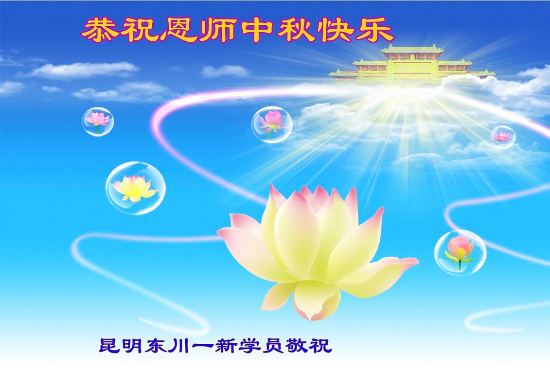 恭祝慈悲伟大的师尊中秋佳节快乐! 感谢师尊对众生的慈悲救度! 感念大法的浩荡洪恩! 做好三件事 中秋月儿圆 弟子把师念 回首正法路 师把徒儿牵 转瞬又一年 誓约记心间 三件事做好 兑现来世愿 师尊天轮转 正法到人间 精進又实修 圆满随师还 弟子叩拜师尊! 合十 成都一学法小组大法弟子和新学员敬上 二零一八年九月十一日恭祝 昆明市东川一新学员恭祝恩师中秋快乐!