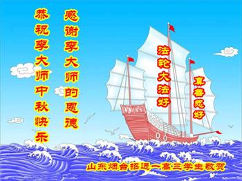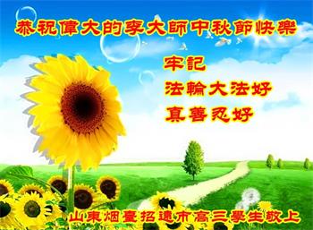 我是高三学生,从小看到爷爷、奶奶炼功学法,我都静心听、看,也学会了打坐,颂李大师的“洪吟”诗歌。上学后,我一直不忘默念:“法轮大法好,真善忍好”。并按要求做个好人,历任班干部,但只当班长,不当团干部,在校是师生爱戴的好学生,成绩名列前茅。这是大法给我的智慧,感谢李洪志大师的恩德! 我一定努力学习,争取明年考上国家一流大学,为李大师争光,证实大法的伟大超常。 谢谢李大师的恩赐! 山东烟台招远乡村一名老叟恭祝李大师中秋节快乐!