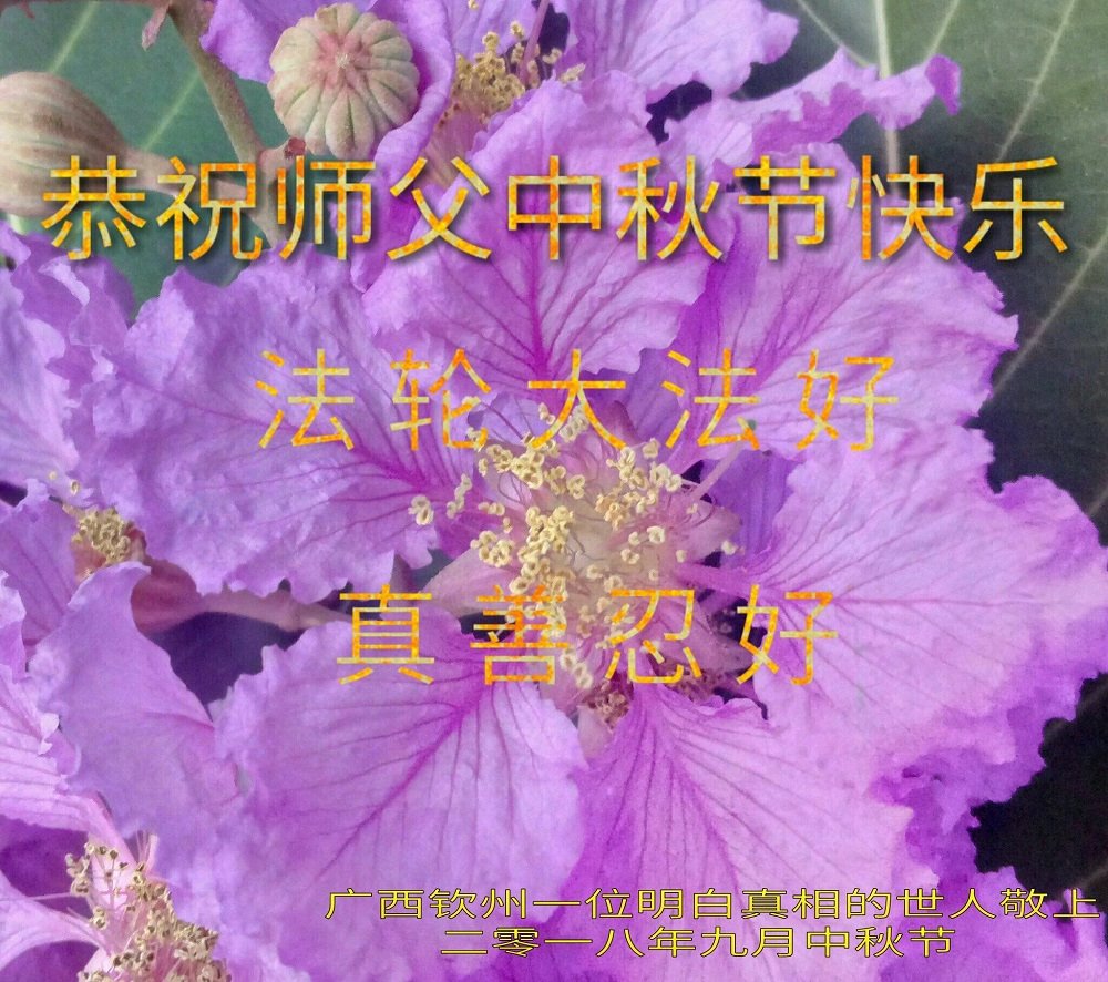 每逢佳节倍思亲。在这一年一度的中秋团圆的节日,倍感思念师尊。师尊您辛苦了! 师尊您为救度芸芸众生,付出了您的全部心血,承受着那难以想象的巨难,面对师尊的洪恩,弟子难以报答。只有听师父的话,精進实修,修好自己,多救人。让师尊少一份操劳,多一份快乐! 广西钦州一位明白真相的世人恭祝大法师父中秋节快乐!