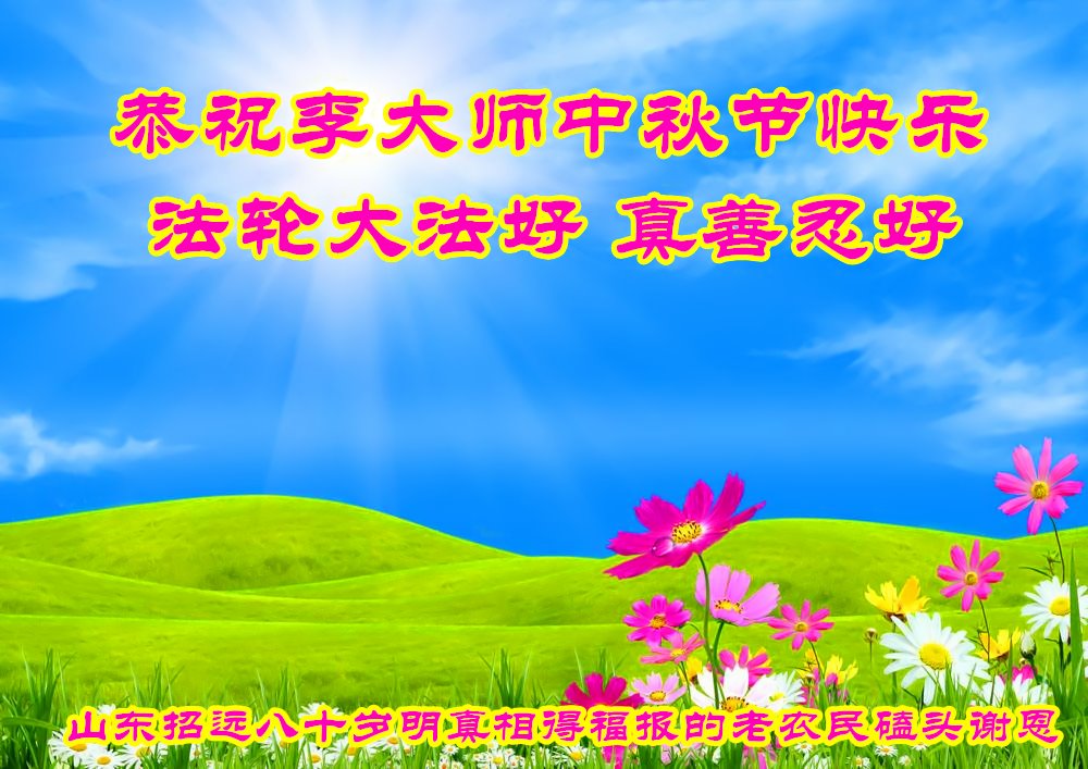 【明慧网二零一八年九月二十四日】 山东烟台招远一八十岁明真相得福报的老农民恭祝李大师中秋节快乐!