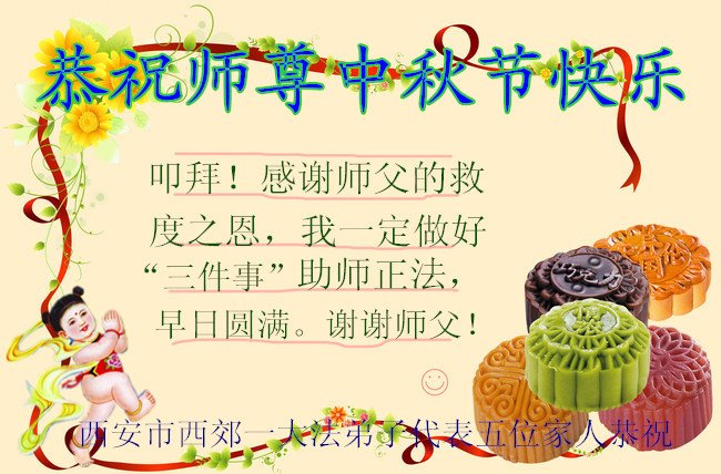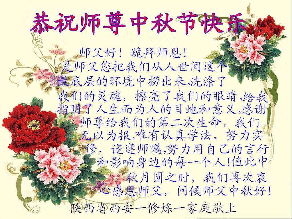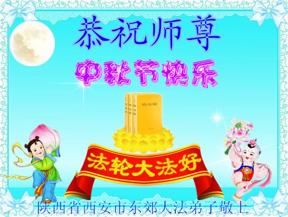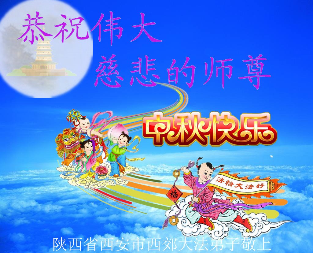师尊中秋节快乐! 叩拜!感谢师父的救度之恩,我一定做好“三件事” 助师正法,早日圆满。谢谢师父! 西安市西郊一大法弟子代表五位家人恭祝 陕西西安部份大法弟子恭祝慈悲伟大的师尊中秋节快乐!