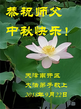 师父您辛苦了,弟子无限思念您,我们将这思念化作精進的动力,做好三件事报答师尊的慈悲苦度! 天津市渤海石油全体大法弟子敬祝 2018-9-22 天津市南开区大法弟子恭祝师父中秋节快乐!