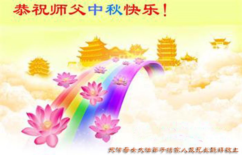 天津北辰大法弟子恭祝师尊中秋节快乐! “中秋”来临,祝伟大慈悲的师父节日快乐!我一定尽全力做好大法弟子应该做的三件事,一思一念一言一行上严格用大法归正自己、修好自己、用心多救人!不负师望!不负使命! 弟子想念师父!大陆大法弟子都想念师父!尤其在这本应团圆的中秋之际! 师恩难报,弟子叩首遥拜,衷心祝吾师节日快乐!盼恩师早日回国! 天津北辰大法弟子 天津一大法弟子恭祝慈悲伟大的师尊中秋节快乐!