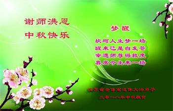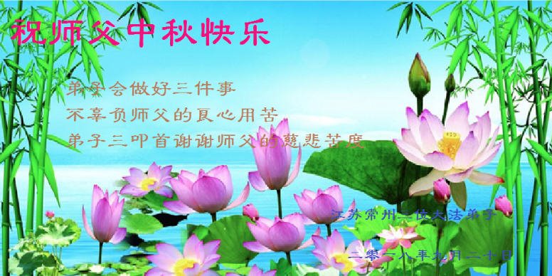 我修炼大法二十一年了,感恩师父的慈悲苦度,感恩法轮大法,要不负师恩,唯有勇猛精進再精進,赶上去,多学法,多救人,做好三件事,告诉所有的有缘人记住法轮大法好,师父是来救人的。愿师父少一份操劳,多一份欣慰。 江苏省常州地区一学法小组全体大法弟子恭祝师父中秋节快乐!