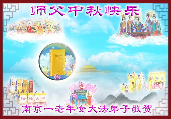 我修炼大法二十一年了,感恩师父的慈悲苦度,感恩法轮大法,要不负师恩,唯有勇猛精進再精進,努力奔跑赶上去,多学法,多救人,做好三件事,告诉所有的有缘人记住“法轮大法好”,师父是来救人的。愿师父少一份操劳,多一份欣慰。 江苏南京市一老年女大法弟子恭祝师父中秋节快乐!