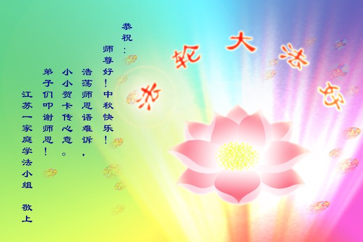 师父您好! 法轮大法好!师尊您辛苦了! 去人心,去执着,让主元神主宰一思一念,在法中同化,圆满随师还。 江苏无锡一学法小组全体大法弟子恭祝慈悲伟大的师尊中秋节快乐!