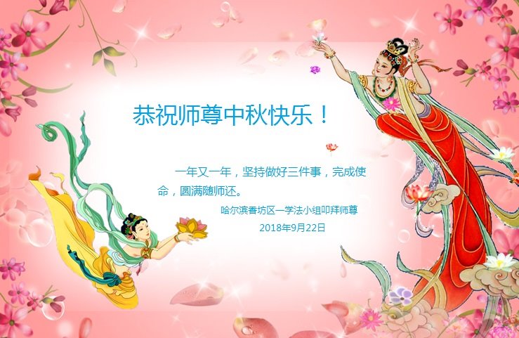 值此中秋节来临之际,黑龙江省哈尔滨阿城区朝阳小区全体大法弟子祝师尊中秋节快乐!弟子想念师尊,盼师尊早日回大陆。 请师尊放心,弟子们一定坚修大法,听师父的话,坚持集体学法,定期交流,整体提高,整体升华,做好三件事,多救人,不愧正法时期大法弟子的称号,跟师父圆满回家。 黑龙江省哈尔滨阿城区朝阳小区全体大法弟子 2018年9月22日 黑龙江省哈尔滨大法弟子恭祝师尊中秋佳节快乐!