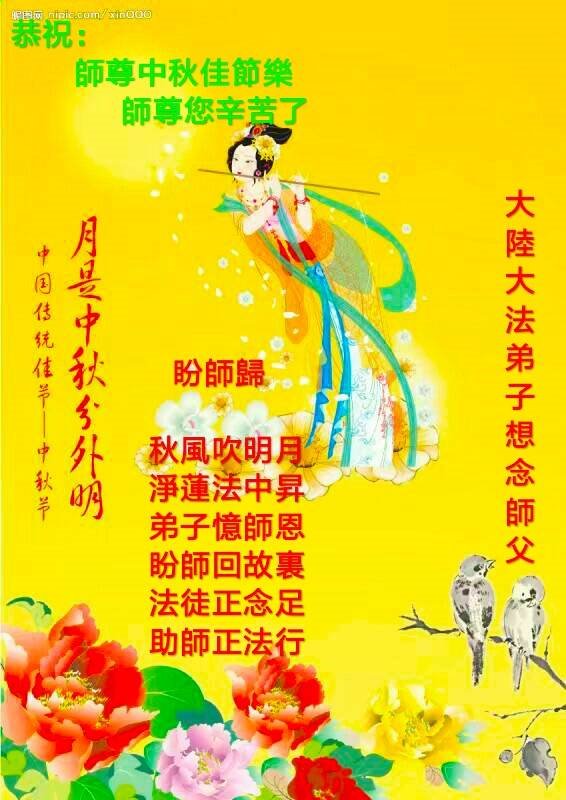 有很多话想说给师父,又知道师父看着不争气的弟子停在半坡慢挪步,弟子急,知道师父更急,“师父:对不起!”虽怕面对师父,但必须面对师父,请师父加持弟子去掉安逸心,精進实修。弟子以一颗对大法坚如磐石的心祝师尊中秋快乐! 四川一青年弟子恭祝师父中秋快乐!