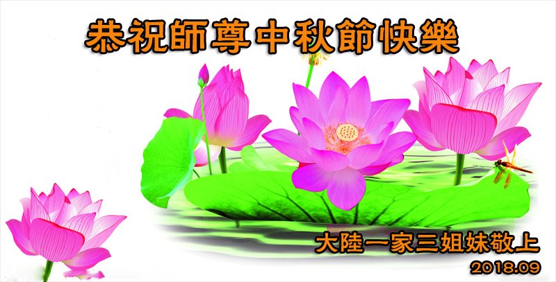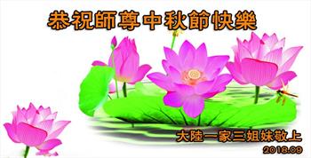 在这中秋来临之际,首先祝师尊中秋快乐!弟子叩拜师尊,谢师尊的救度之恩,弟子会逆流而上,遇事向内找,无条件同化大法,达到新宇宙标准,不辜负师尊慈悲救度。 山东省滨州市阳信县大法弟子 2018年9月16日 大陆东北大法弟子恭祝师尊中秋快乐!