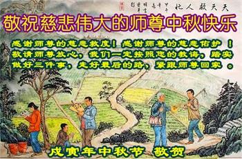 师尊传法又一秋, 慈悲众生免劫难, 复兴传统文化秀, 谁知师尊多辛苦。 大法弟子心里明, 精進紧跟师尊走, 助师正法救众生, 完成使命随师还。 辽宁抚顺一中年女大法弟子恭祝师尊中秋快乐!