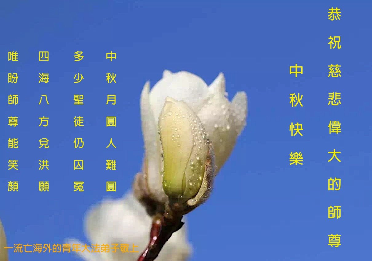 恭祝师尊中秋节快乐! 金秋佳节弟子向师尊献上节日的祝愿,您辛苦了,为了众生您操尽了心,弟子一定紧跟正法進程,助师正法,完成史前世愿。 山东省枣庄市大法弟子 2018-09-23 一流亡海外青年大法弟子恭祝师尊中秋快乐!