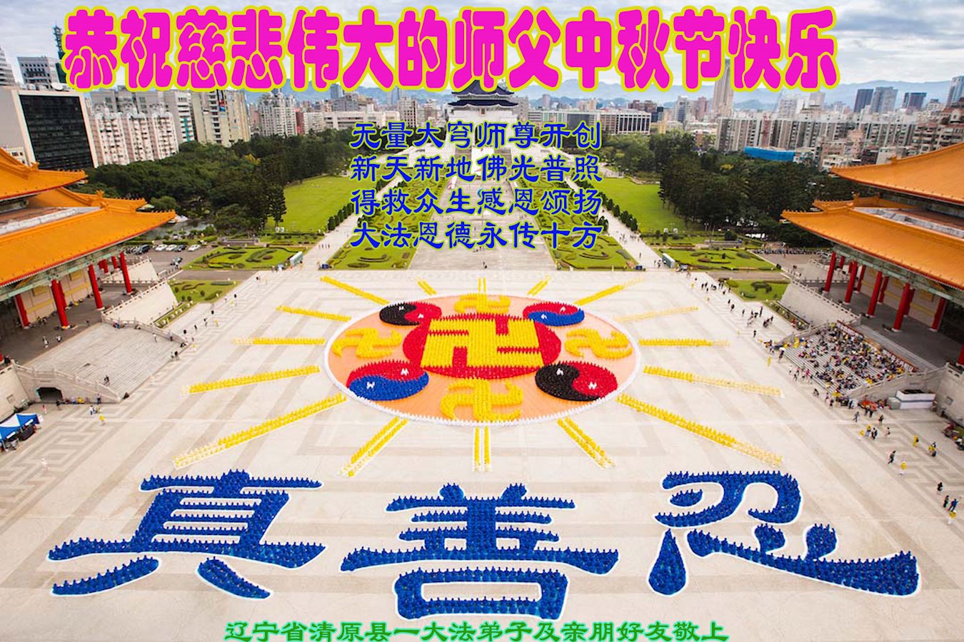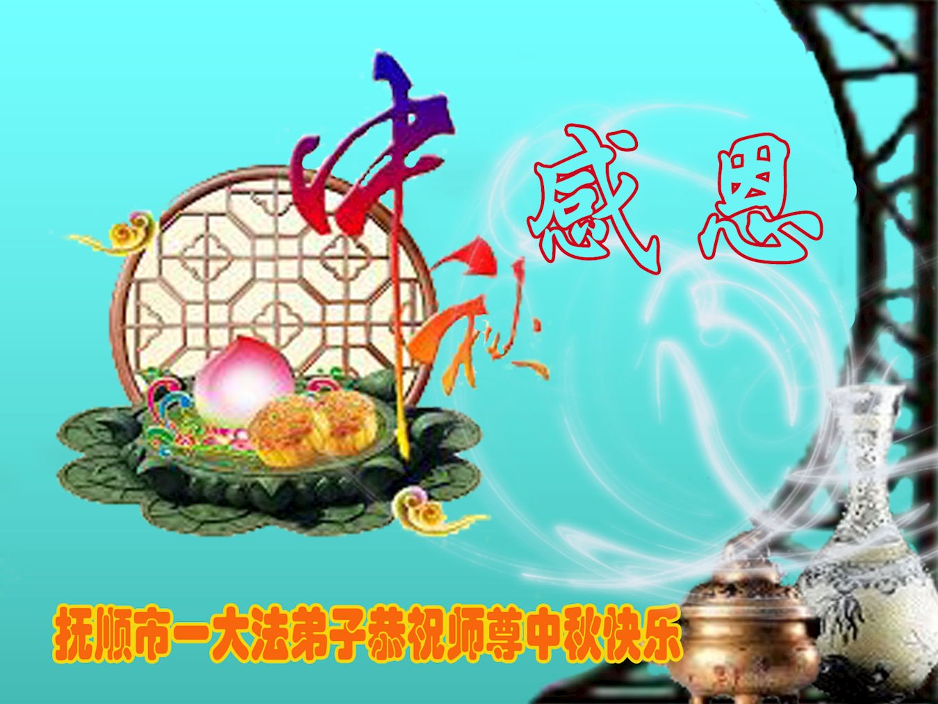 感 恩 无量大穹师尊开创 新天新地佛光普照 众生得救共同欢笑 大法恩德永世传颂 辽宁省抚顺市望花区-学法小组大法弟子敬贺师尊中秋快乐!