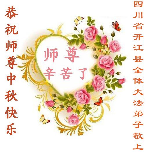 师父好,我们是四川省三台县的大法弟子,我们代表三台的大法弟子给师父送上最美好的祝愿,师尊辛苦了,感谢师尊的慈悲苦度!我们现在能精進实修了。在这中秋佳节之日,祝愿师父中秋快乐!我们要认真的完成师尊交代的三件事,更加精進,惟愿师尊笑。 黑龙江省绥化市海伦市全体大法弟子恭祝师尊中秋快乐!弟子叩谢师恩!