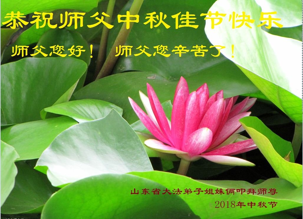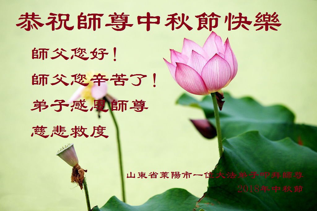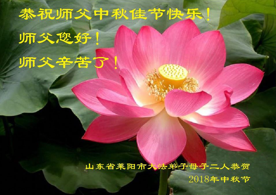 弟子们双手合十向师尊致以节日的问候:师父,您好!师父,您辛苦了!弟子们感谢您的慈悲苦度。弟子们会更加精進,多学法,学好法,发正念,讲真相,多救人,努力做好师父要求的三件事,兑现誓约,完成使命。 山东省烟台市莱阳市一学法小组全体大法弟子向慈悲伟大的师尊致以崇高的敬意,衷心恭祝慈悲伟大的师尊中秋佳节快乐!