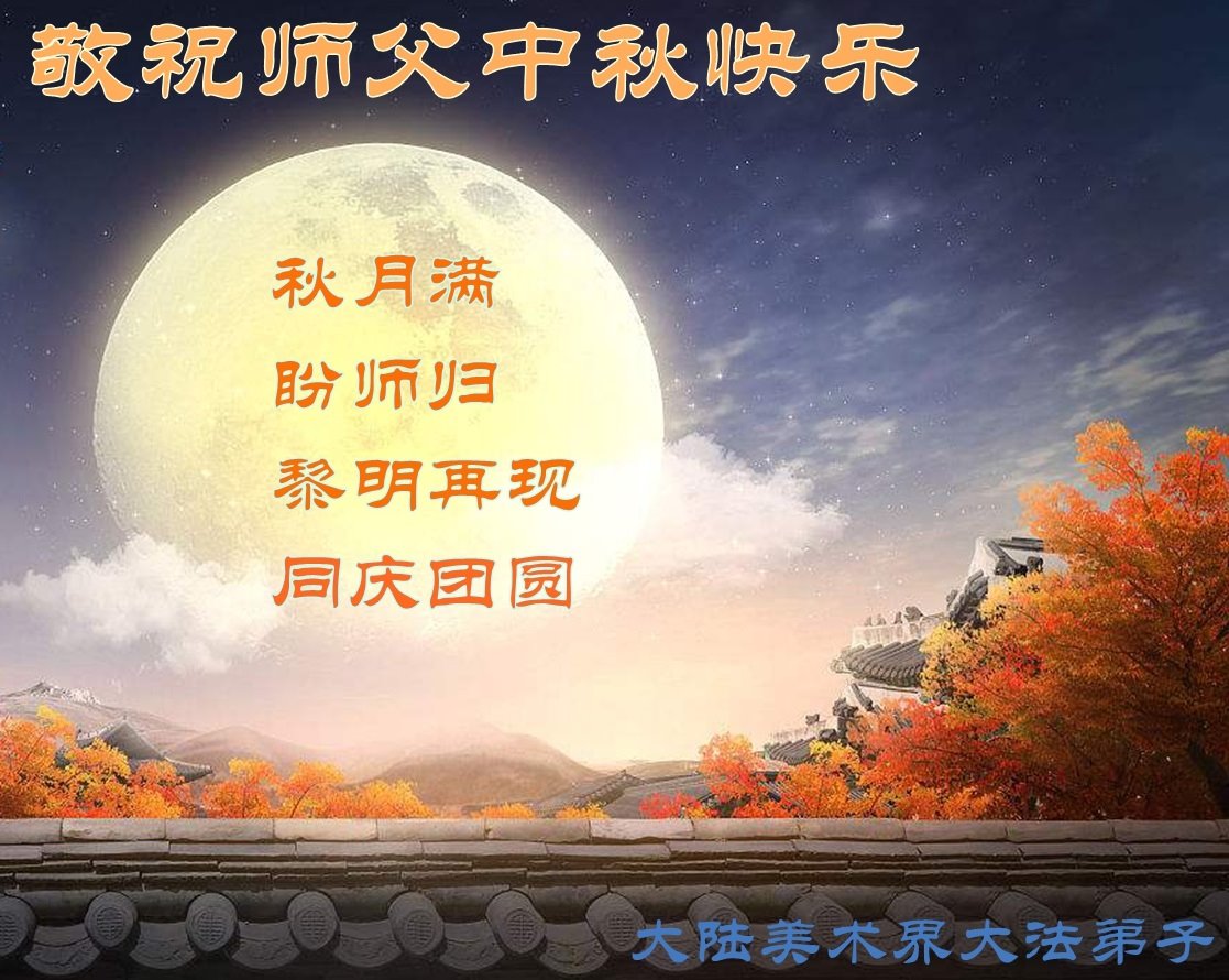 中秋佳节月高悬 月照两岸盼师还 主尊历尽万般苦 慈悲洪愿正法传 无量王主来中原 千秋万世等机缘 大法洪传天门开 为救众生真相传 浩瀚苍宇慈悲度 万佛归位返天园 大穹天体法光照 今朝正法路通天 二零一八年九月十三日 大陆美术界大法弟子恭祝师父中秋快乐!