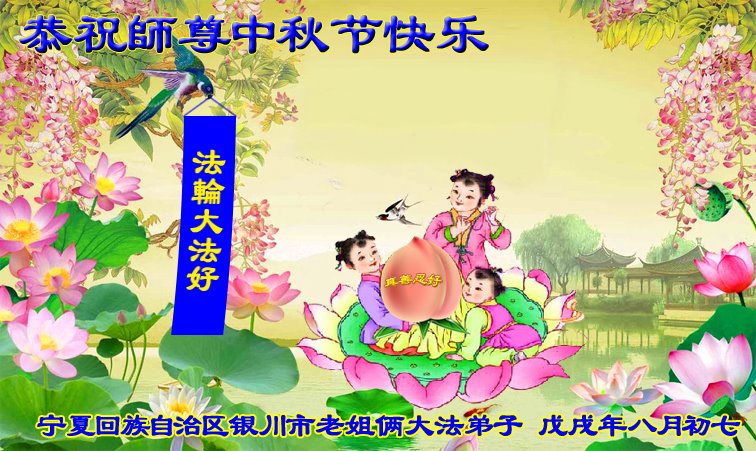 感恩师尊传大法,佛恩浩荡沐我家;尊师信法学帮带,全家归位再回家。 宁夏回族自治区银川市姐妹俩大法弟子恭祝慈悲伟大的师尊中秋节快乐!