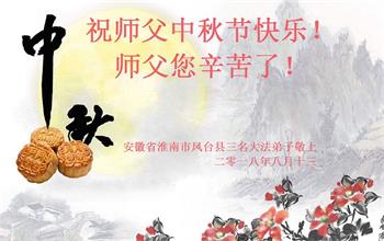 助师正法度众生 中秋佳节月非圆 对天仰望忆恩师 盼望师尊回中原 法徒精進随师还 永祝恩师笑开颜 安徽合肥肥东一大法弟子恭祝师父中秋节快乐! 安徽省淮南市凤台县三名大法弟子祝师父中秋节快乐!师父您辛苦了!