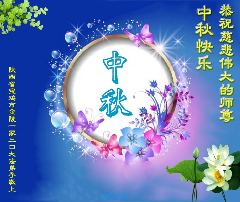 中秋添正念 精進救人急 世人明真相 同拜颂师恩 盼师神韵归 人神返天堂 青岛市全体教师大法弟子合十敬拜 陕西宝鸡金陵大法弟子学法小组及一家三口恭祝师尊中秋快乐!
