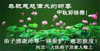 慈悲伟大的师尊您好!在师尊用巨大的付出延续来的时间里,我们大陆大法弟子一定会做好三件事,抢人、救人、多救人,不辜负师尊慈悲苦度,圆满随师还。叩拜师尊:师尊您好!师尊您好!您辛苦了!大陆大法弟子非常非常想念您! 河北秦皇岛市全体大法弟子恭祝师尊中秋节快乐!