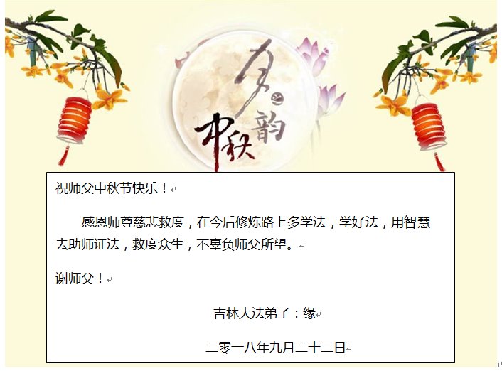 【明慧网二零一八年九月二十四日】 吉林大法弟子恭祝师父中秋快乐!