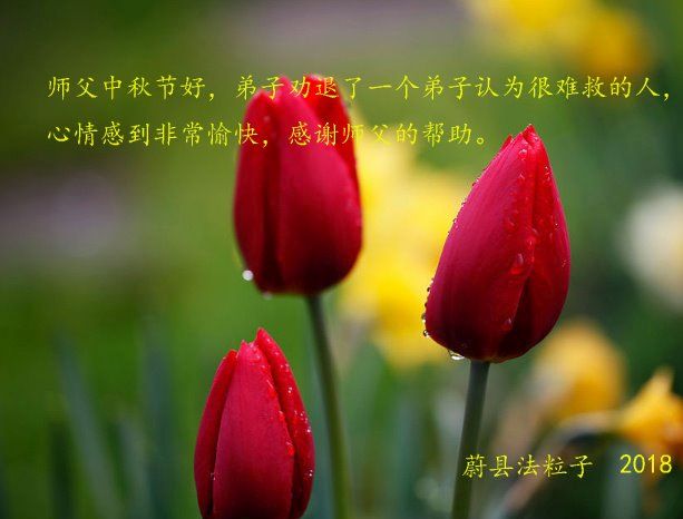 弟子一定要修好自己的一思一念,天天向内找,勇猛精進。6岁外孙女说:祝师父中秋节快乐!师父辛苦了!我也要跟师父回家。 河北省张家口市怀来县一位老年大法弟子祝师父中秋节快乐!