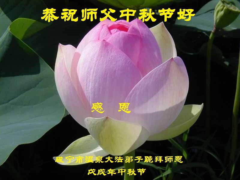 湖北省咸宁市温泉大法弟子恭祝师父中秋节快乐! 师父领我们走在神的路上,真是佛恩浩荡,用尽人类的语言也表达不了,感谢师父的救度之恩。 在今后不多的时间里,用心做好三件事,精進不停多救人,兑现誓约,跟师父回家。 咸宁市温泉大法弟子跪拜师恩 戊戌年中秋节 湖北省咸宁市温泉大法弟子恭祝师父中秋节快乐!