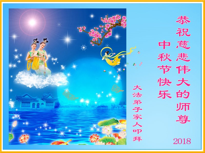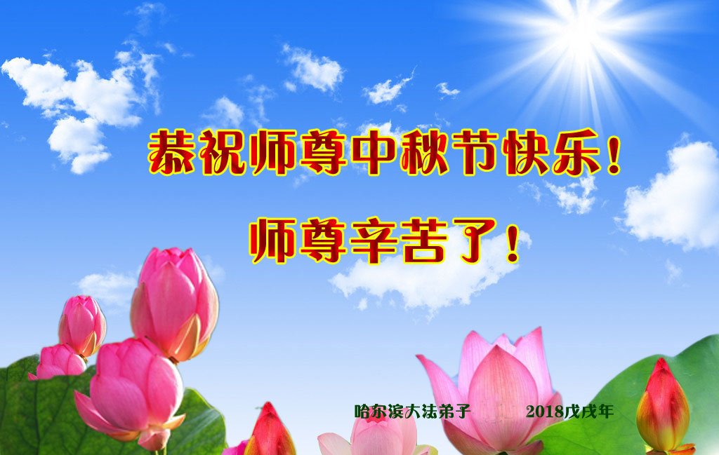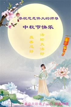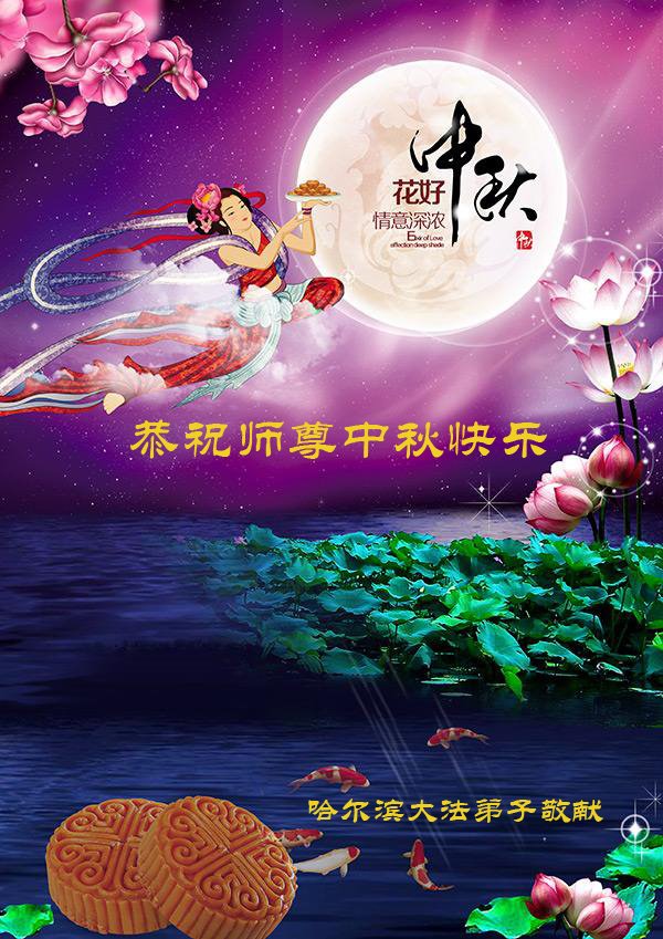 我们虽在异乡,因种种原因未能和更多的同修接触,但我们按着师父教导的去做,并从“明慧网”上了解了正法進程,听网上同修的交流,也很有收获。请师父放心。 黑龙江省牡丹江大法弟子恭祝师尊中秋节快乐!