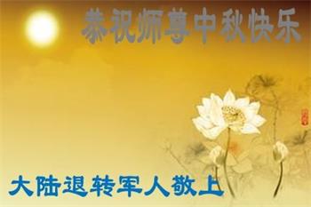 弟子们感恩伟大的师尊的慈悲救度和为弟子及众生的巨大承受,无以为报,只有听师父的话,跟师尊走,继续做好三件事,让师尊少操一份心,多一些欣慰! 总参系统全体退伍转业军人大法弟子叩拜师尊! 二零零八年九月二十二日 原四川省成都军区大法弟子恭祝师尊中秋节快乐!