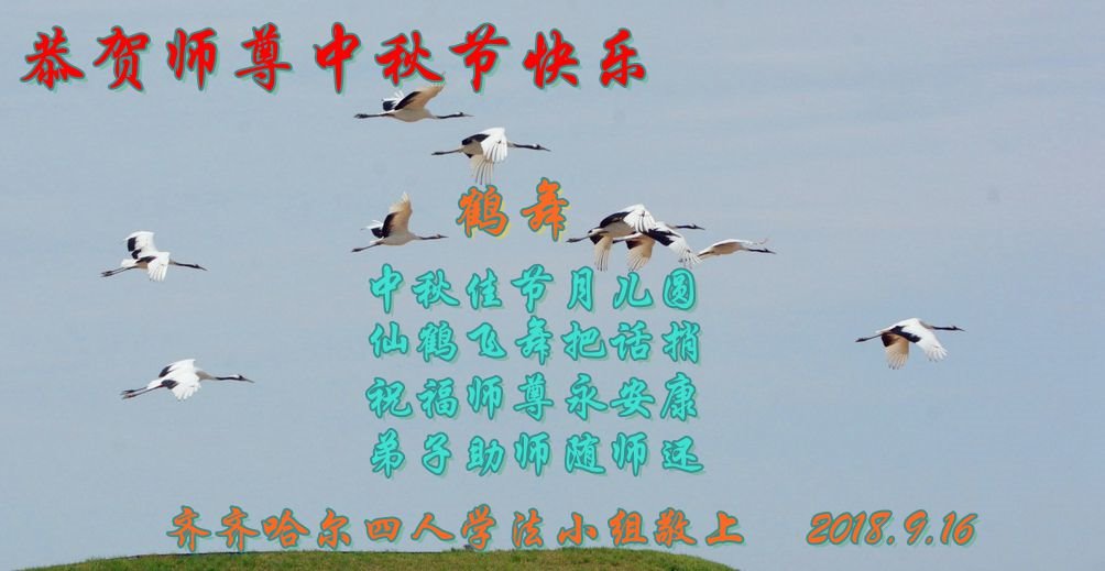鹤舞 中秋佳节月儿圆 仙鹤飞舞把话捎 祝愿师尊永快乐 弟子助师随师还 齐齐哈尔四人学法小组敬上 2018.9.18 黑龙江大庆让胡路区龙庆远望小区大法弟子恭祝师尊中秋节快乐!