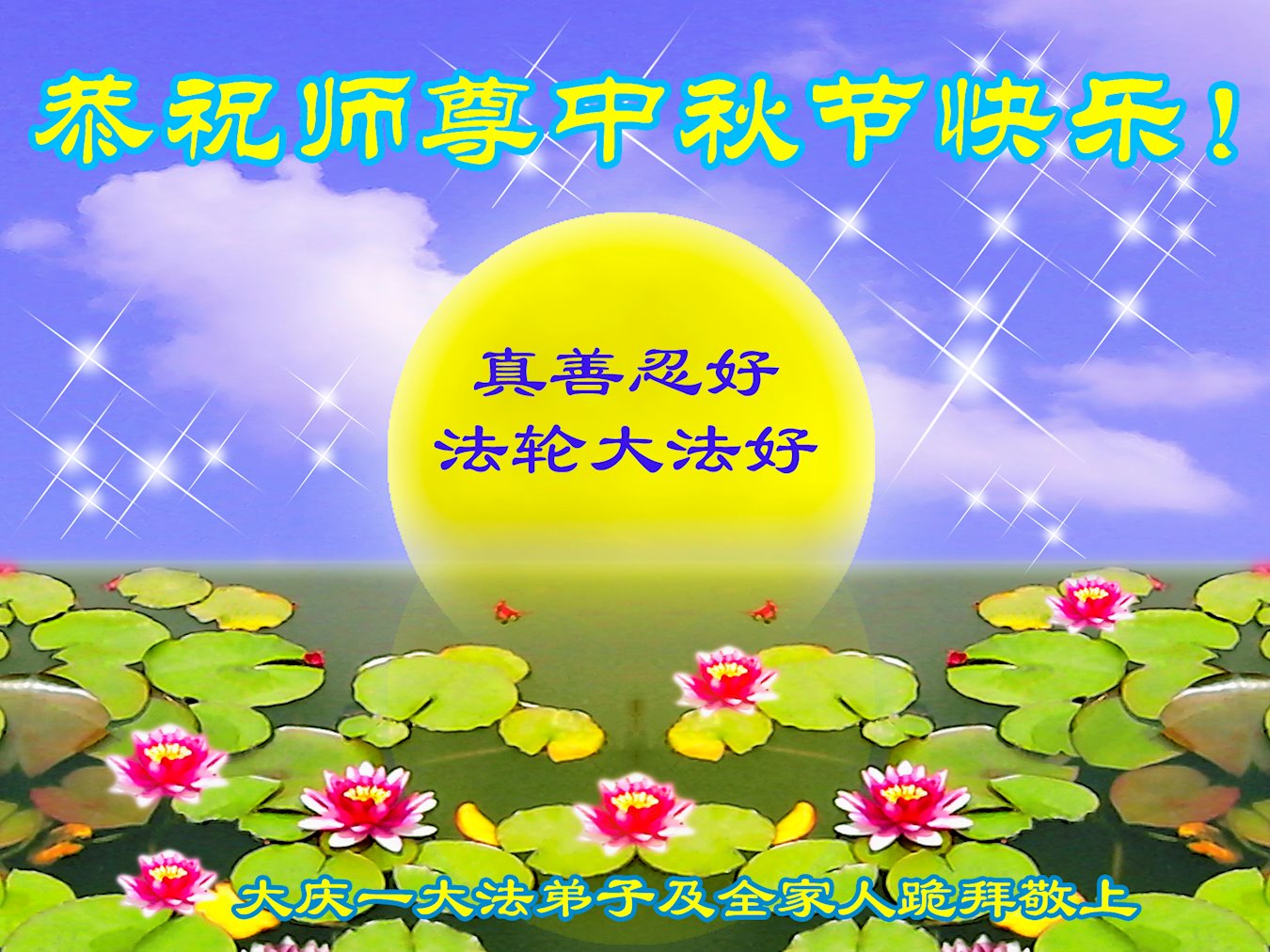黑龙江省大庆一大法弟子及全家人恭祝慈悲伟大的师尊中秋节快乐!感恩师尊的慈悲救度,谢谢师尊!跪拜师尊!