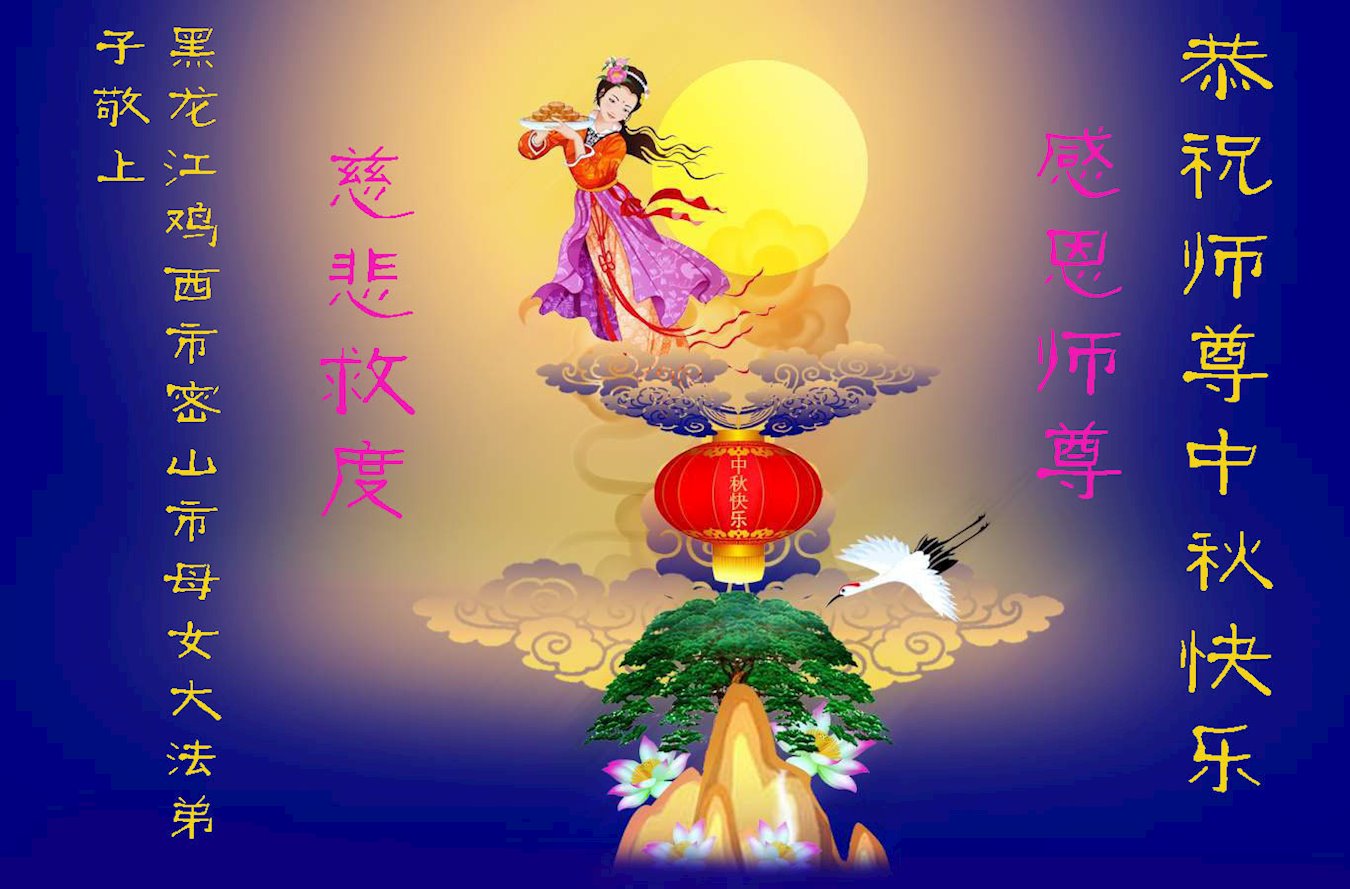 年年中秋月儿圆,今又逢中秋月又圆。天上月圆师徒难团圆,泪眼遥望西天方。思潮澎湃似泉涌,徒儿难报师尊恩。师尊谢谢您,您为芸芸众生承受一年又一年。望明月盼师尊,师徒何时再团圆。只有做好三件事,紧跟师尊的正法進程。让师尊少一份操劳,多一份欣慰,惟愿师尊笑。 跪拜师尊,合十! 遥祝慈悲伟大的师尊中秋节快乐! 黑龙江鸡西市密山市母女大法弟子恭祝师尊中秋快乐!